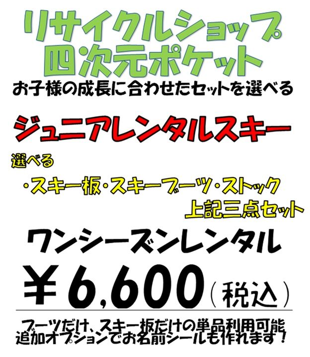 リサイクルショップ四次元ポケットのジュニアレンタルスキーは、雪国で子育てをする私たちにとって、もはや必要不可欠なサービスかもしれません。